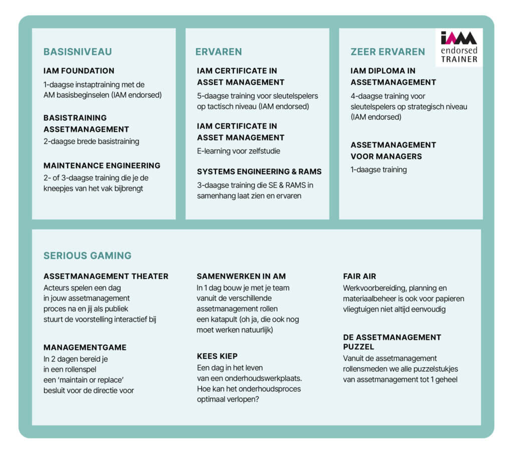 • een 2-daagse basistraining assetmanagement (verkorte versie van de IAM Certificate training zonder examen)