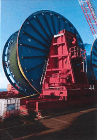 Een reel drive systeem kun je vergelijken met een grote haspel. Op de reel (“de haspel”) zit flexibel product gespoeld wat je erop en eraf kunt spoelen. Dit reel drive systeem staat op een schip, en wordt in combinatie met andere systemen gebruiken om kabels vanaf bijvoorbeeld een windmolenpark in zee naar land te leggen.